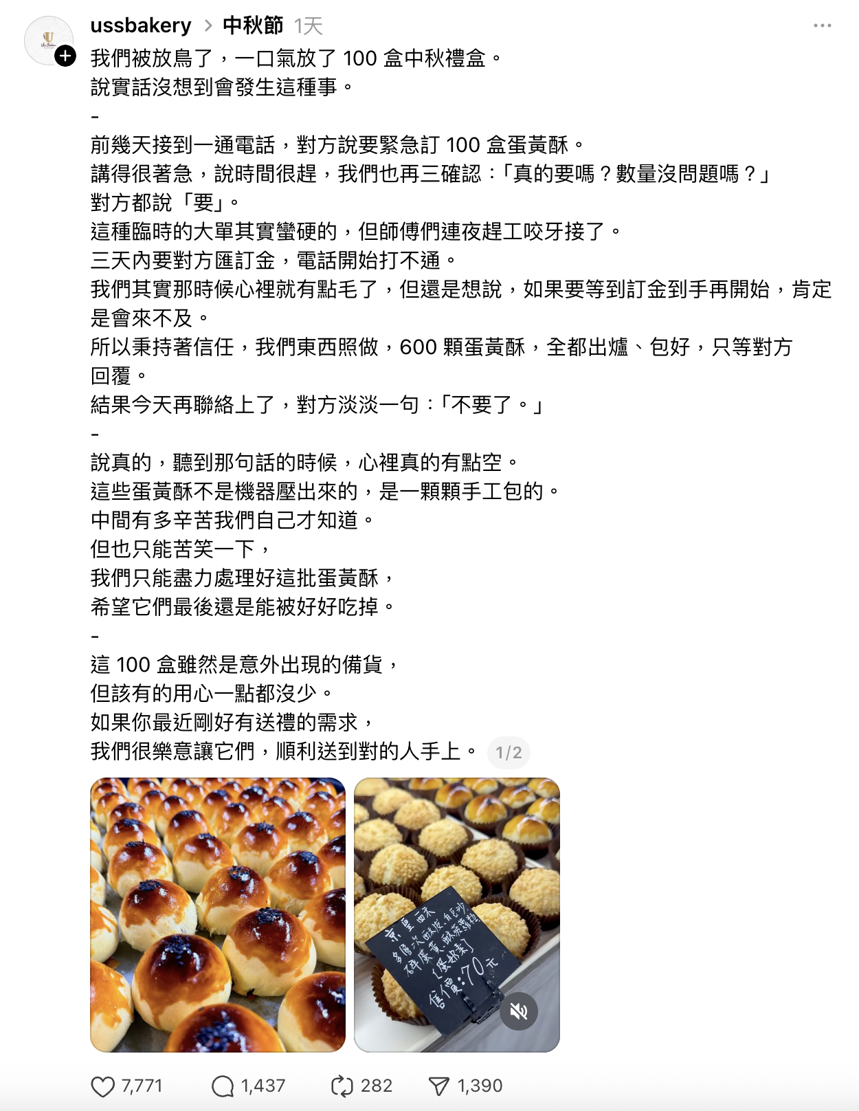 店家在接獲訂單後,雖感訂購量龐大,但仍全力趕工完成600顆蛋黃酥的生產與包裝。然而,配送當日,訂購人臨時表示不需要此批禮盒,引發店家損失。店家隨即於社群平台發文,表達自身遭遇與心情,也在 Threads 上公開部分過程,引起網友關注與熱議。