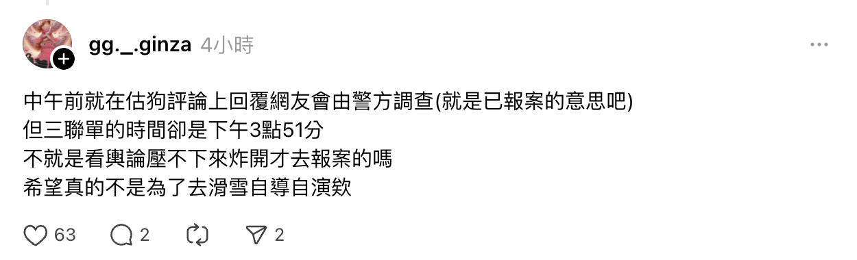 中午前就在估狗評論上回覆網友會由警方調查(就是已報案的意思吧) 但三聯單的時間卻是下午3點51分 不就是看輿論壓不下來炸開才去報案的嗎 希望真的不是為了去滑雪自導自演欸