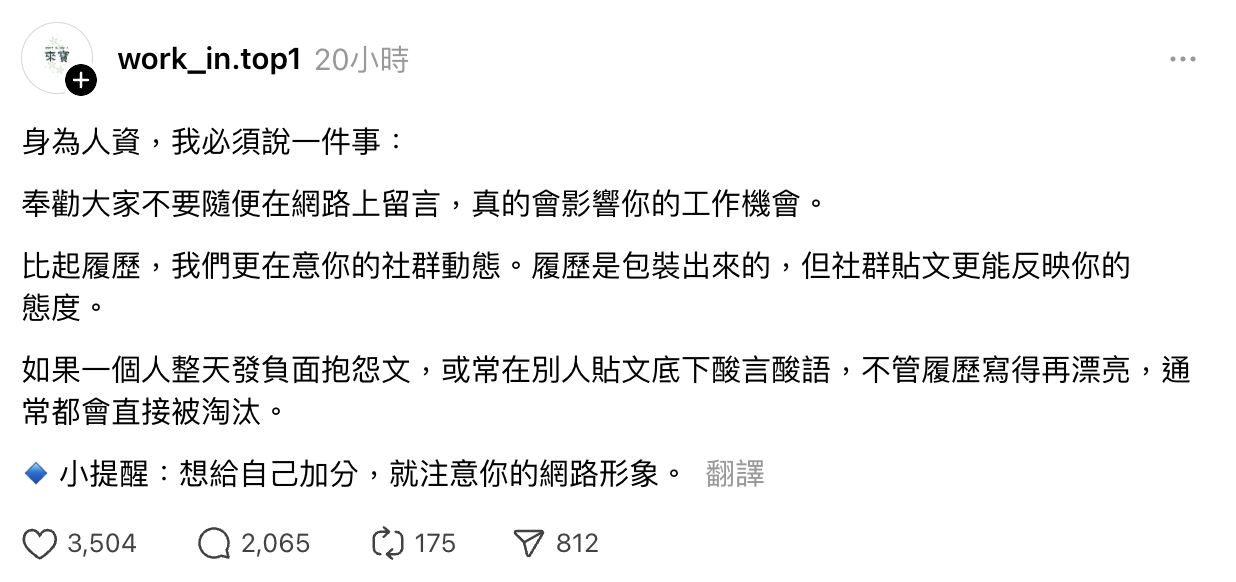 近期在 Threads 上,一名人資的一句話引發廣泛討論。她表示:「奉勸大家不要隨便在網路上留言,真的會影響你的工作機會。」這名人資強調,比起履歷,公司更在意求職者在社群平台上的動態,因為「履歷可以包裝,但貼文卻藏不住一個人的真實個性」。