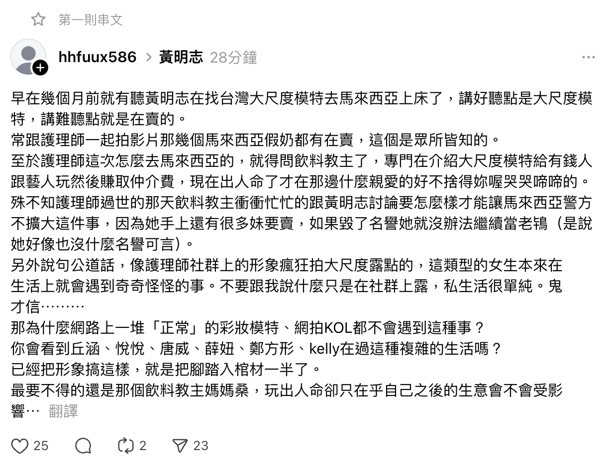 然而,在官方調查之外,網路上出現了新的說法。一名自稱熟悉內情的網友「hhfuux586」發文:「早在幾個月前就有聽黃明志在找台灣大尺度模特去馬來西亞上床了,講好聽點是大尺度模特,講難聽點就是在賣的。 常跟護理師一起拍影片那幾個馬來西亞假奶都有在賣,這個是眾所皆知的。 至於護理師這次怎麼去馬來西亞的,就得問飲料教主了,專門在介紹大尺度模特給有錢人跟藝人玩然後賺取仲介費,現在出人命了才在那邊什麼親愛的好不捨得妳喔哭哭啼啼的。 殊不知護理師過世的那天飲料教主衝衝忙忙的跟黃明志討論要怎麼樣才能讓馬來西亞警方不擴大這件事,因為她手上還有很多妹要賣,如果毀了名譽她就沒辦法繼續當老鴇(是說她好像也沒什麼名譽可言)。 另外說句公道話,像護理師社群上的形象瘋狂拍大尺度露點的,這類型的女生本來在生活上就會遇到奇奇怪怪的事。不要跟我說什麼只是在社群上露,私生活很單純。鬼才信⋯⋯⋯ 那為什麼網路上一堆「正常」的彩妝模特、網拍KOL都不會遇到這種事? 你會看到丘涵、悅悅、唐威、薛妞、鄭方形、kelly在過這種複雜的生活嗎? 已經把形象搞這樣,就是把腳踏入棺材一半了。 最要不得的還是那個飲料教主媽媽桑,玩出人命卻只在乎自己之後的生意會不會受影響⋯」。
