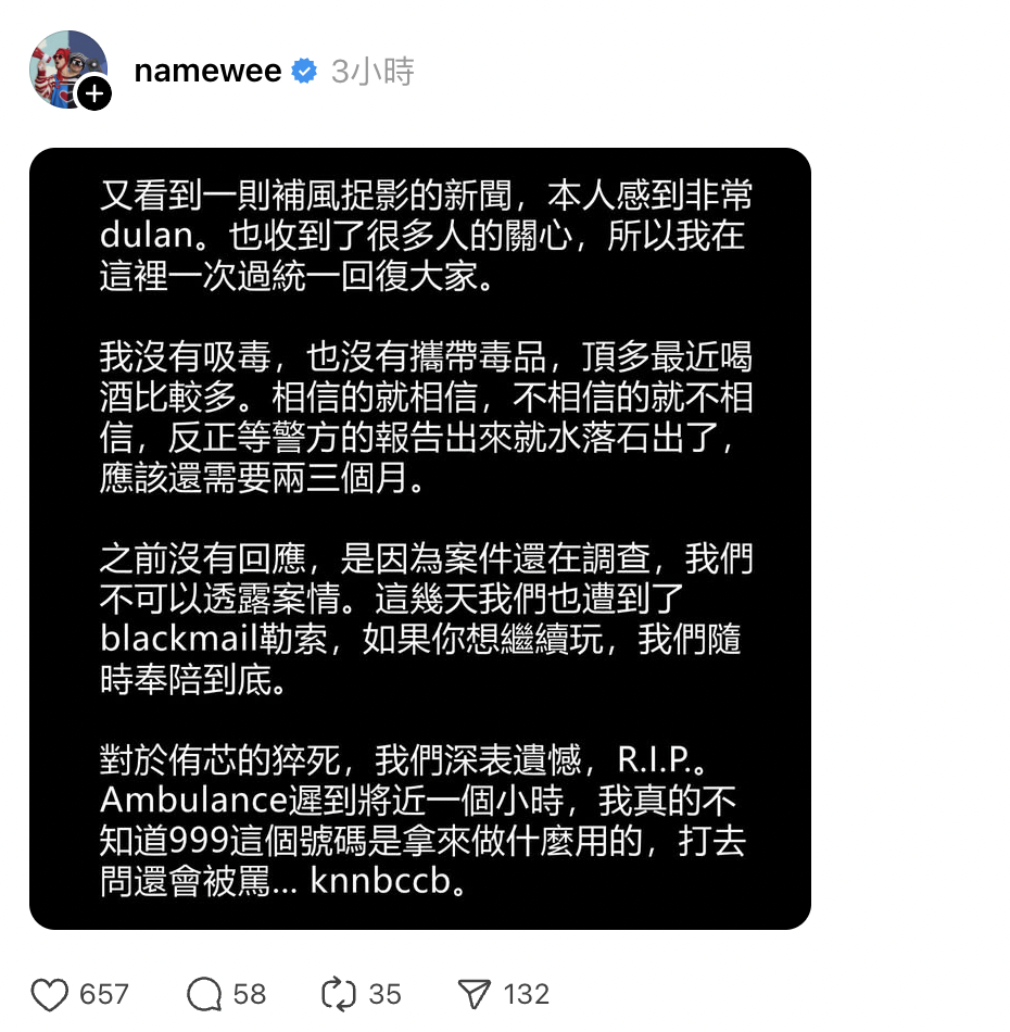 面對鋪天蓋地的輿論與媒體報導,黃明志稍早也在社群媒體上發聲。他以黑底白字貼文回應:「又看到一則捕風捉影的新聞,本人感到非常dulan。也收到了很多人的關心,所以我在這裡一次過統一回覆大家。我沒有吸毒,也沒有攜帶毒品,頂多最近喝酒比較多。相信的就相信,不相信的就不相信,反正等警方的報告出來就水落石出了,應該還需要兩三個月。之前沒有回應,是因為案件還在調查,我們不可以透露案情。這幾天我們也遭到了blackmail勒索,如果你想繼續玩,我們隨時奉陪到底。對於侑芯的猝死,我們深表遺憾,R.I.P。Ambulance(救護車)遲到將近一個小時,我真的不知道999這個號碼是拿來做什麼用的,打去問還會被罵…」。