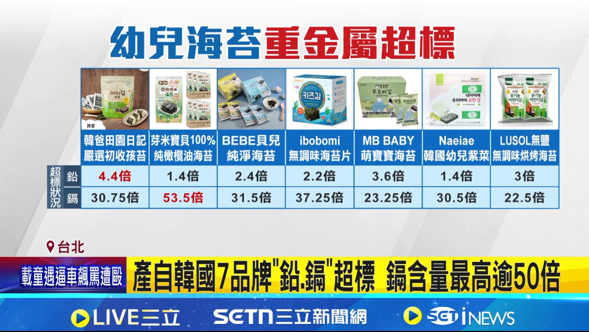 台灣對嬰幼兒海苔食品的規定是鉛含量每公斤不超過0.05毫克,鎘含量每公斤不超過0.04毫克,但這次被爆料出超標的7款海苔品牌中,其中一款甚至超標將近50倍!