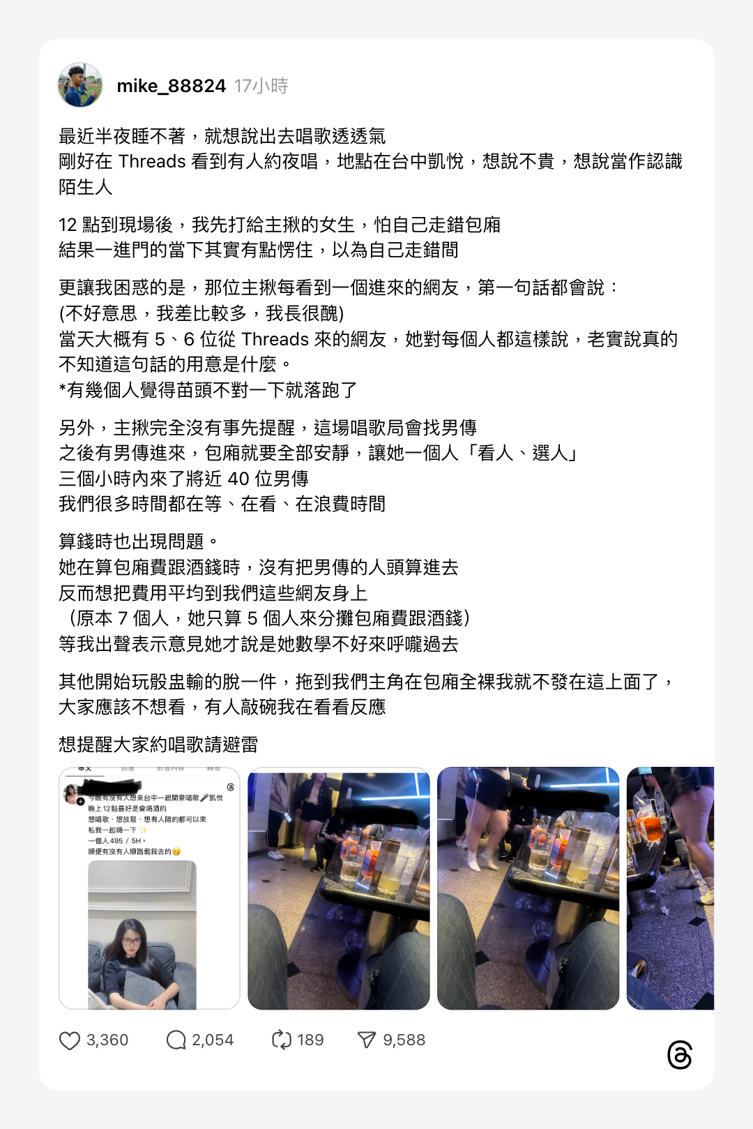 該名網友最後表示,此次經驗與原先單純唱歌、結交朋友的期待差距甚大,因此透過 Threads 分享經過,提醒其他網友在參與網路相約活動前,務必確認活動內容、消費方式與人員安排,以避免類似情況發生。