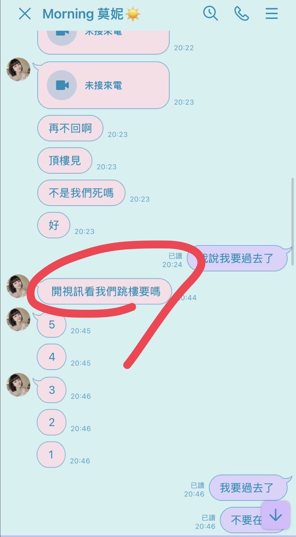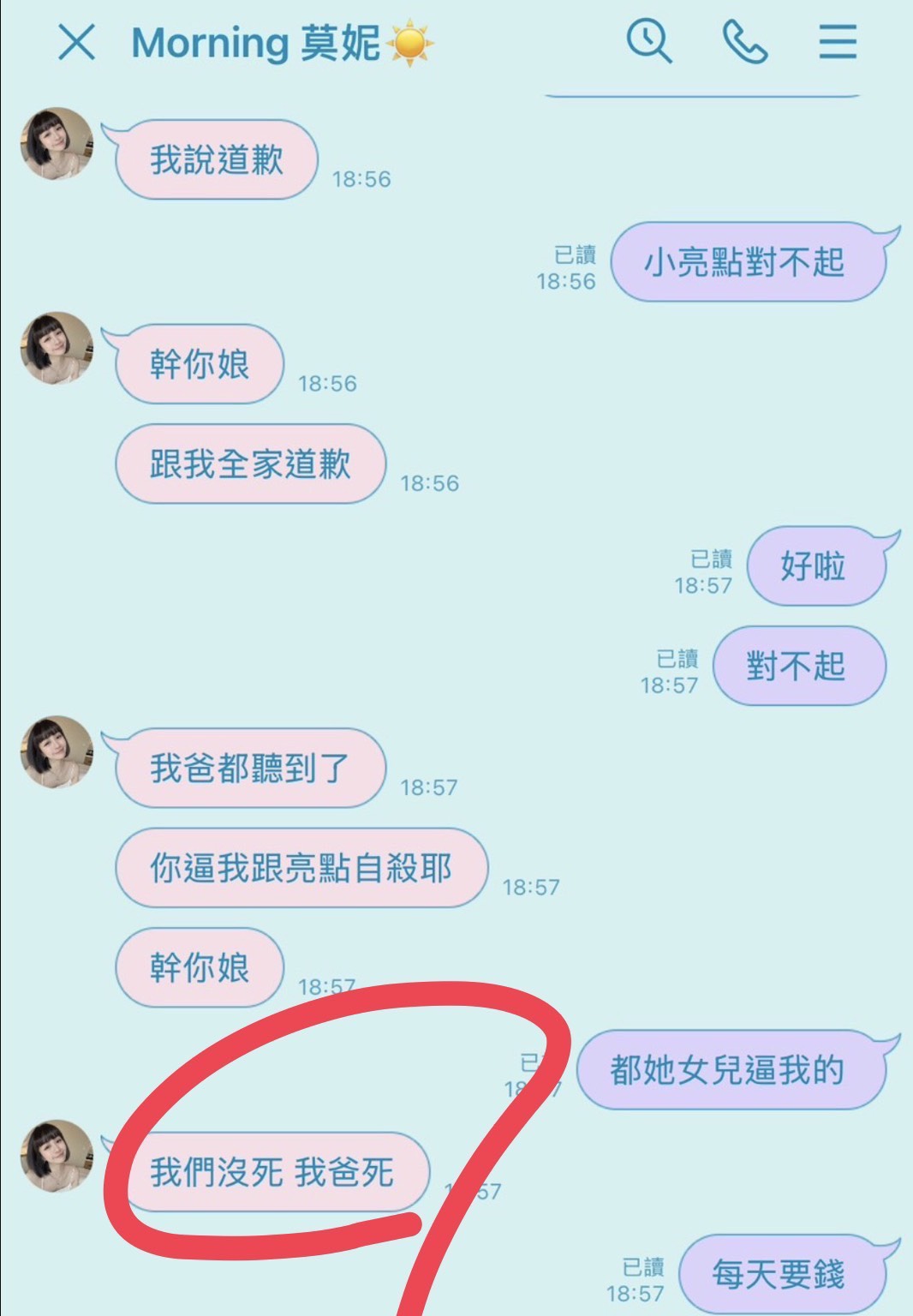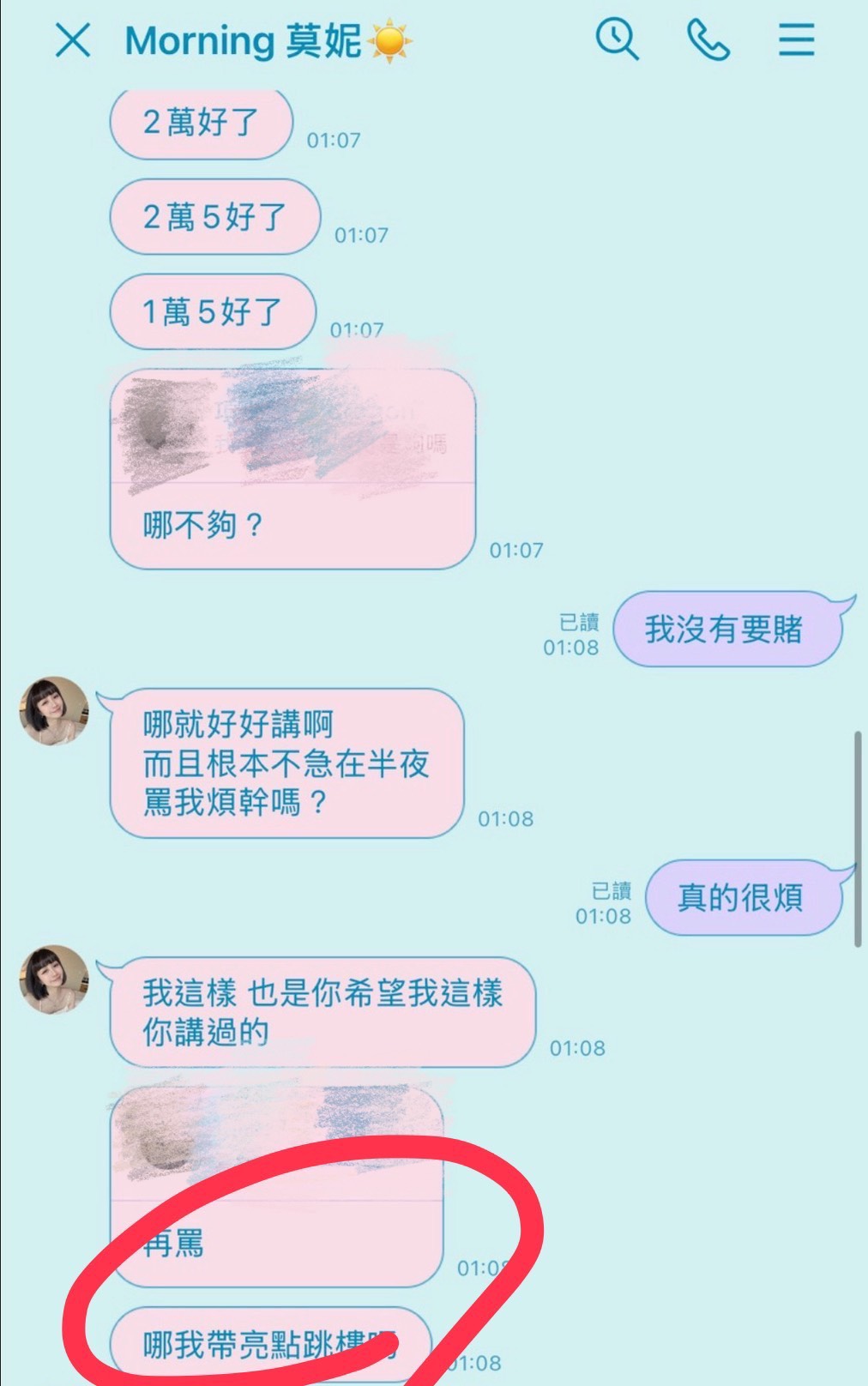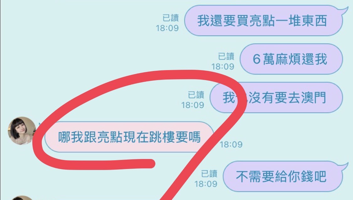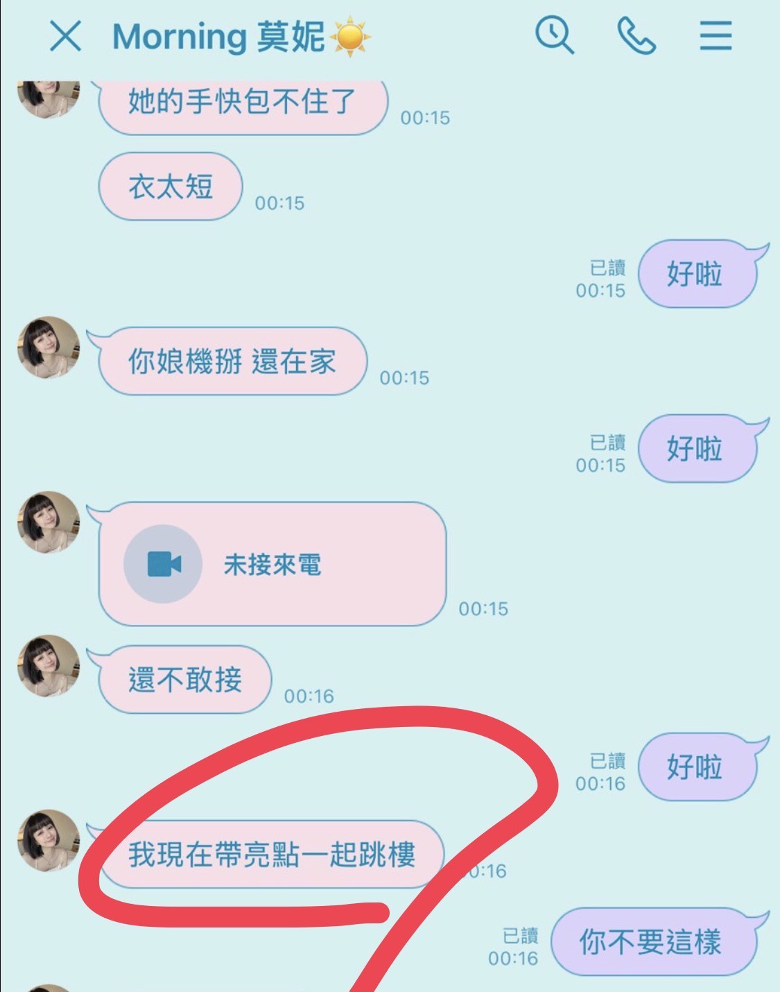 知情人士爆料,多張LINE對話截圖顯示,女子李莫妮與一名男子發生激烈爭執,對話中多次出現「跳下去」、「頂樓見」、「再不讀我跳下去」、「開視訊看我們跳樓要嗎」等字句,同時提及女兒,內容引發外界關注。