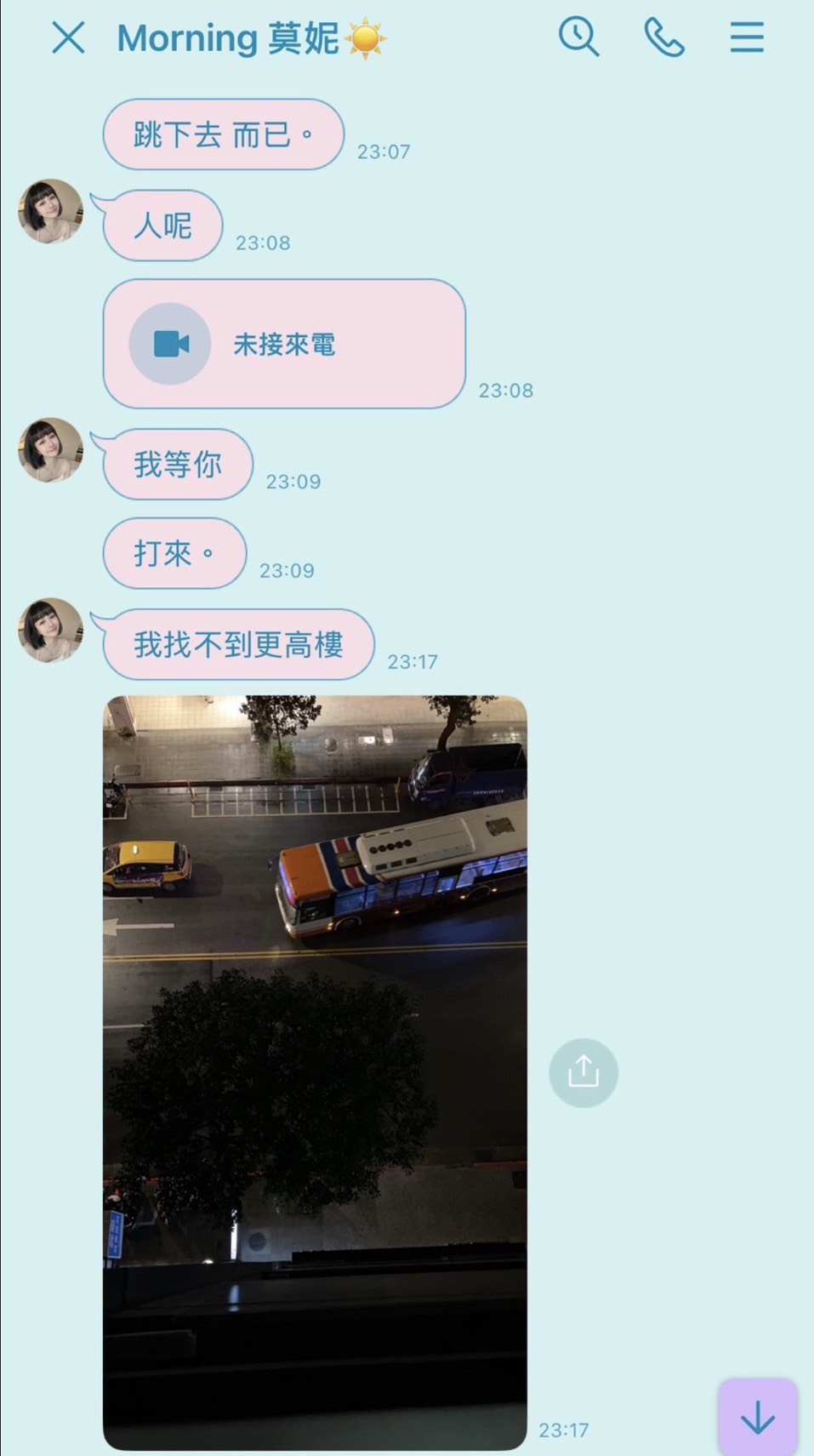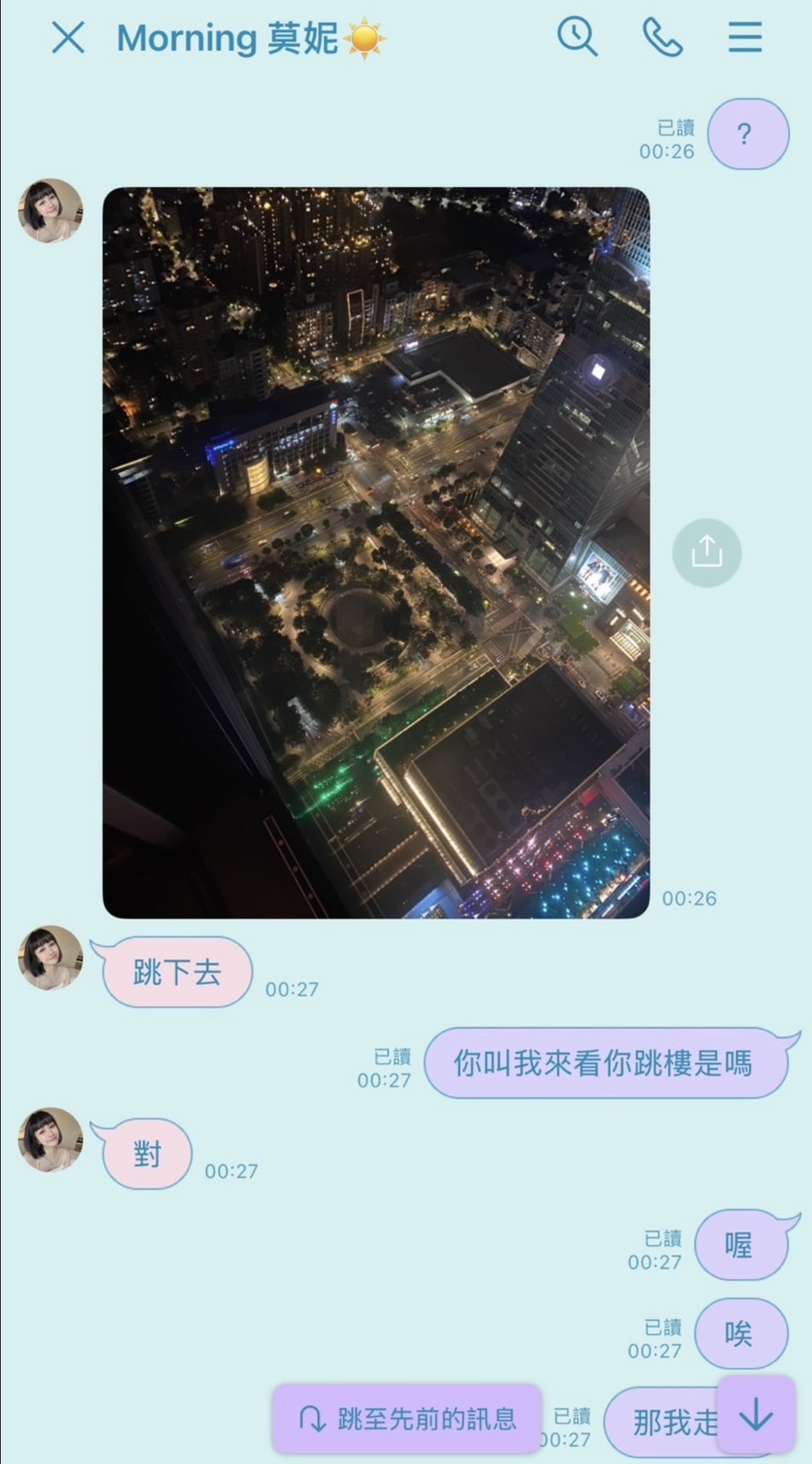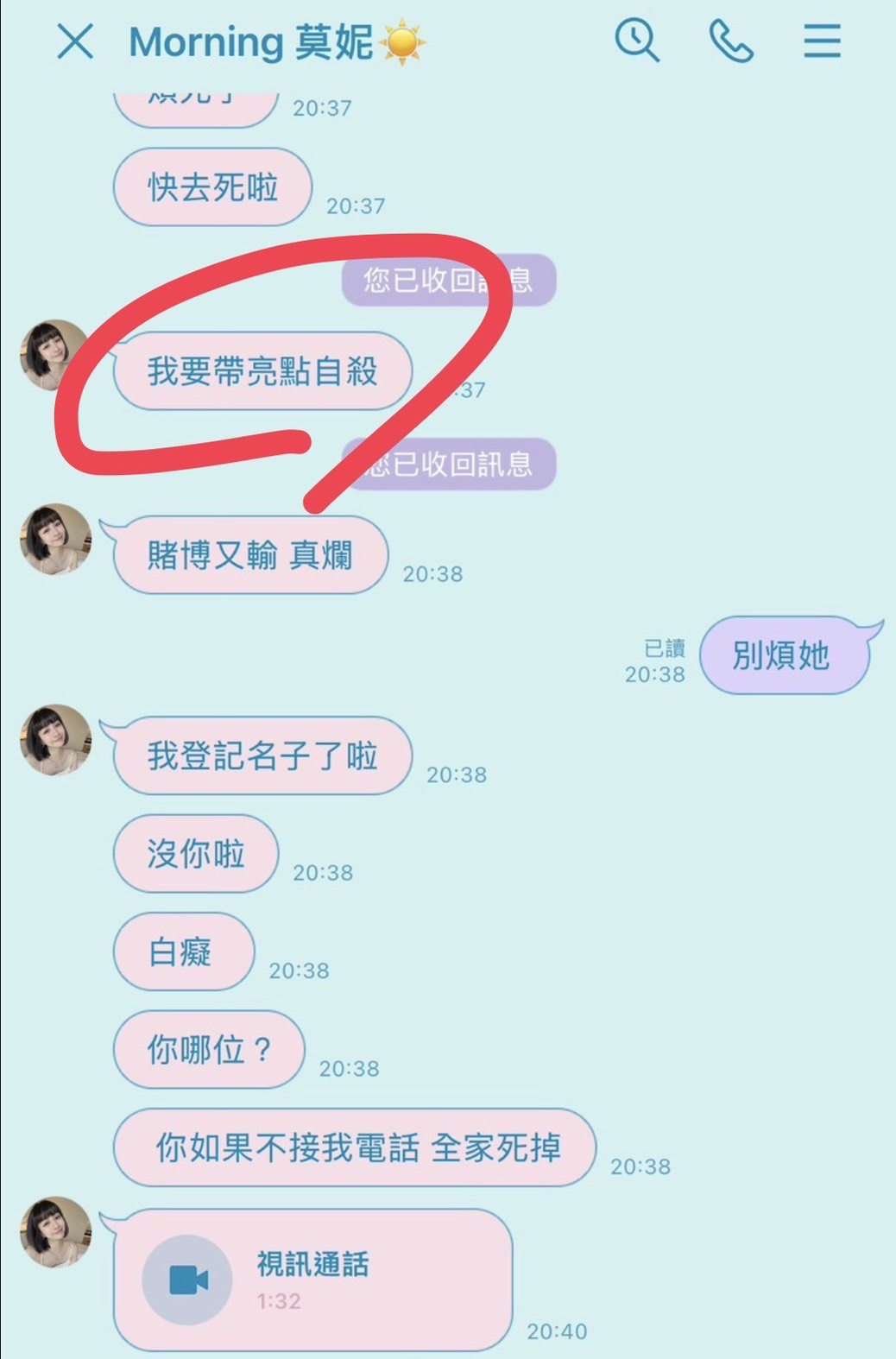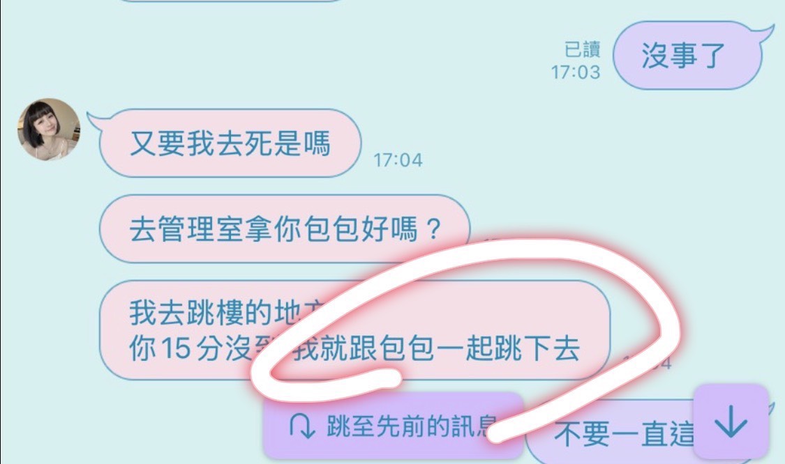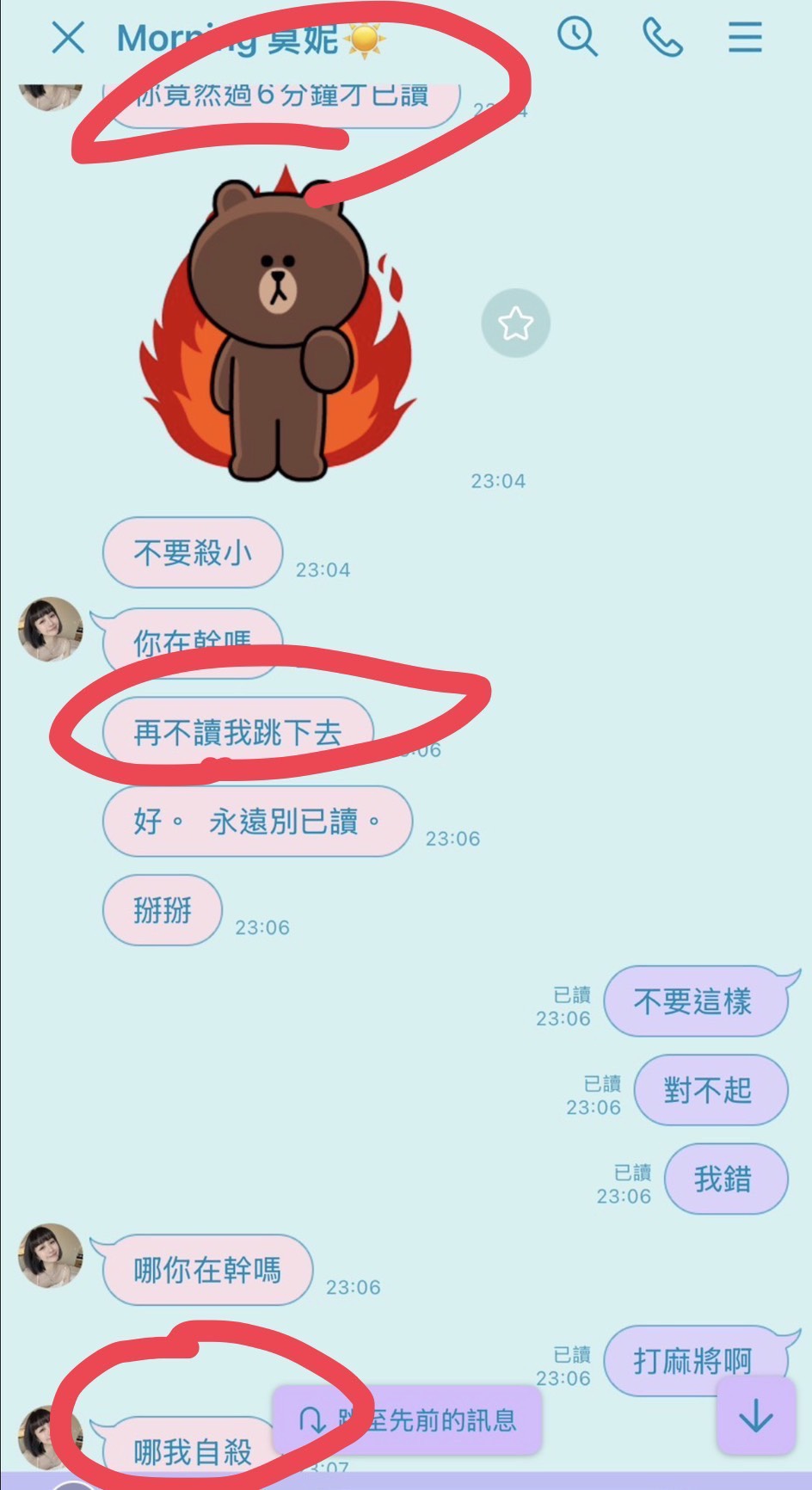 知情人士爆料,多張LINE對話截圖顯示,女子李莫妮與一名男子發生激烈爭執,對話中多次出現「跳下去」、「頂樓見」、「再不讀我跳下去」、「開視訊看我們跳樓要嗎」等字句,同時提及女兒,內容引發外界關注。