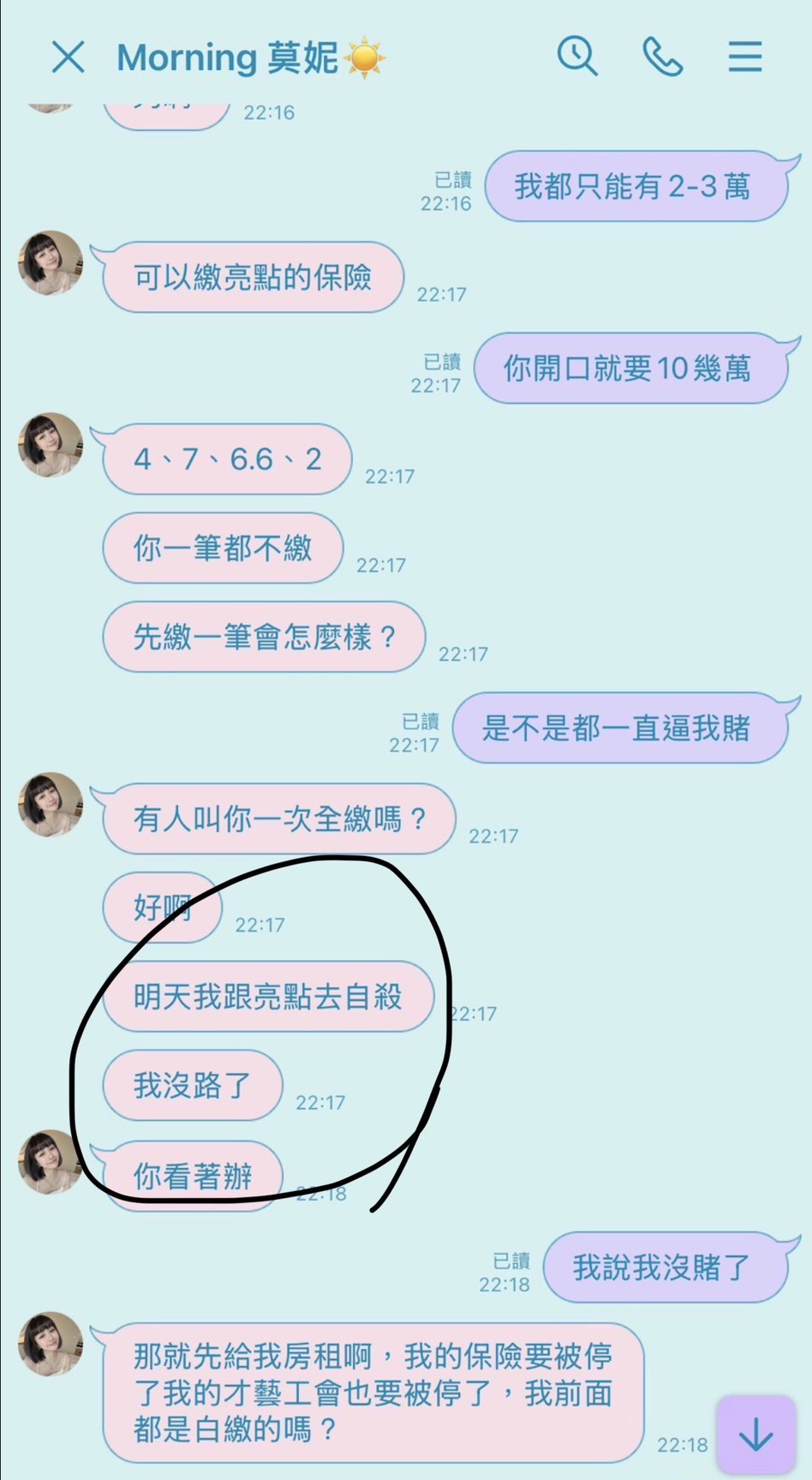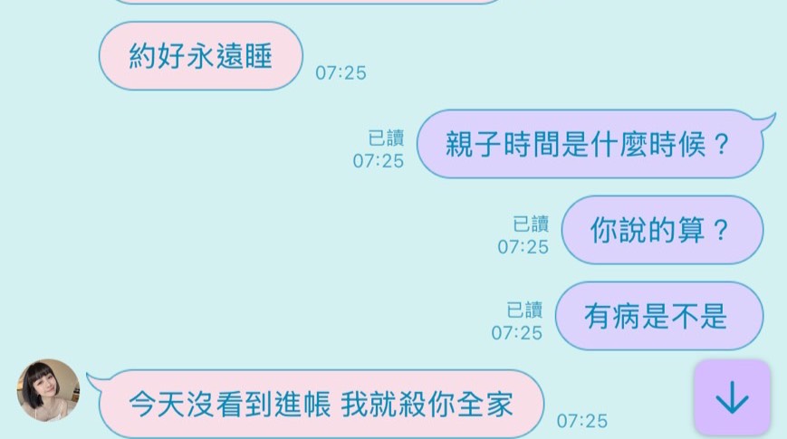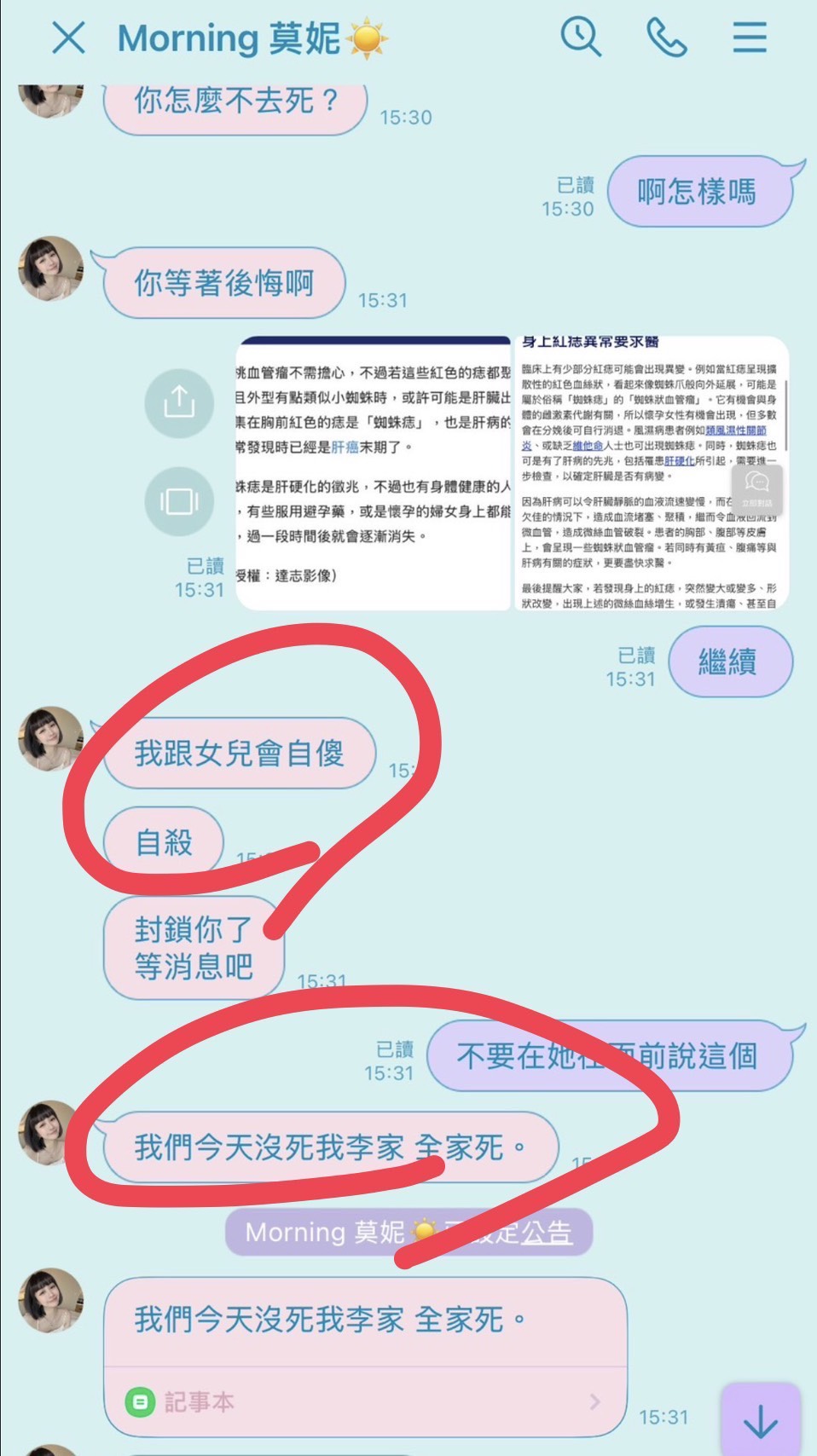 根據截圖顯示,李女於深夜連續傳送訊息,包含「15分鐘沒到我就跟包包一起跳下去」、「我跟女兒會自殺」、「明天我跟亮點去自殺,你看著辦」、「今天沒看到進帳 我就殺你全家」等內容,並出現倒數計時語句。對話中亦可見情緒性辱罵與激烈衝突字句。