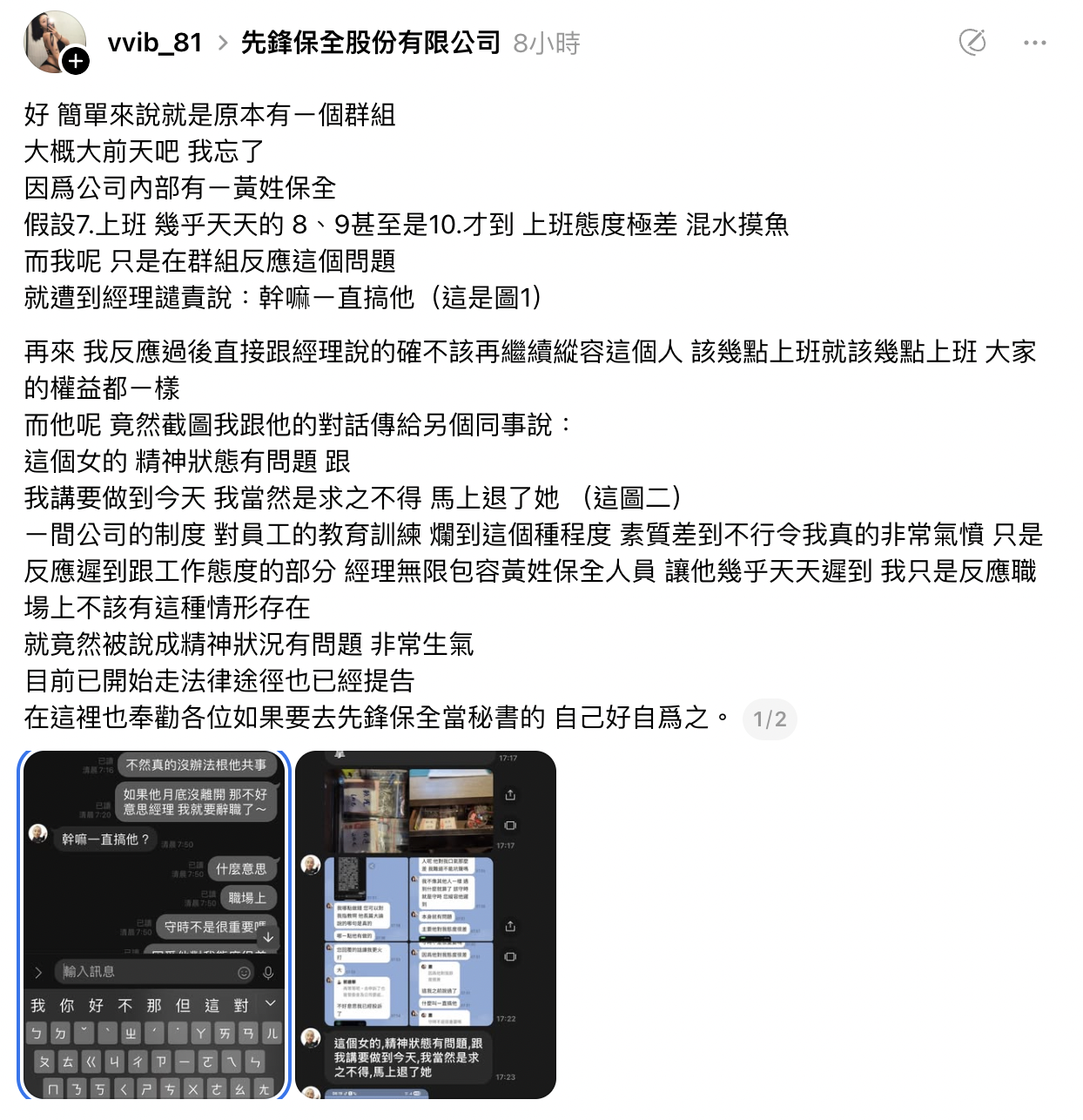 一名女性網友近日在 Threads 上公開指控,自己在「先鋒保全股份有限公司」擔任秘書期間,因為反映同事遲到問題,竟遭到經理不當對待,甚至被貼上「精神狀態有問題」的標籤。此事件一曝光,立即引發網友熱議,矛頭直指職場倫理與管理制度的嚴重缺失。
